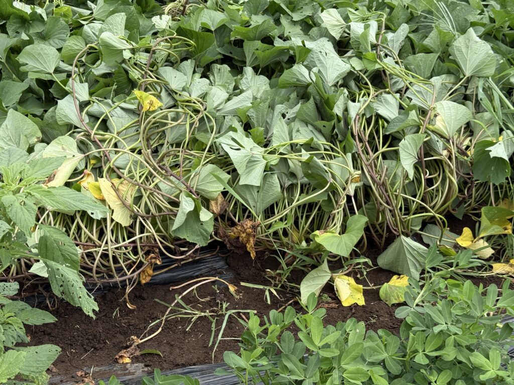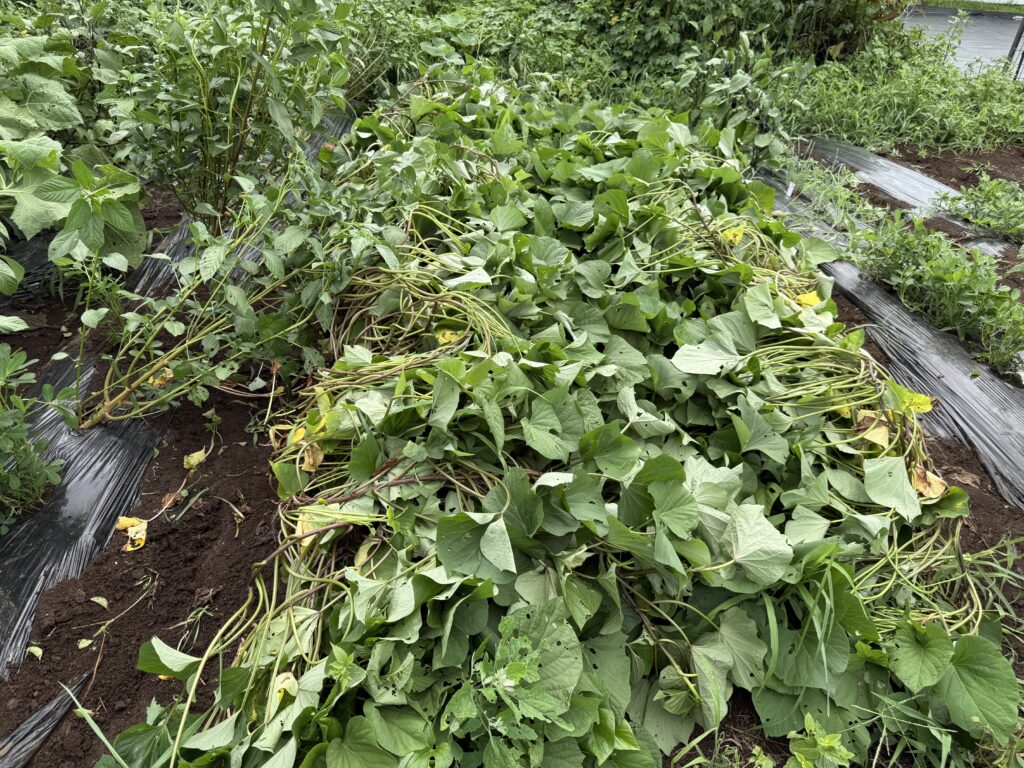 今日のメイン作業は、サツマイモのつる返し。育ちがいい。近所の農家や先週行った茨城県のサツマイモ畑のよりも生育がいい。冬の焼き芋に期待。