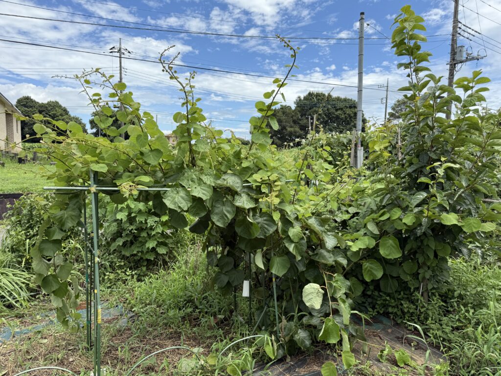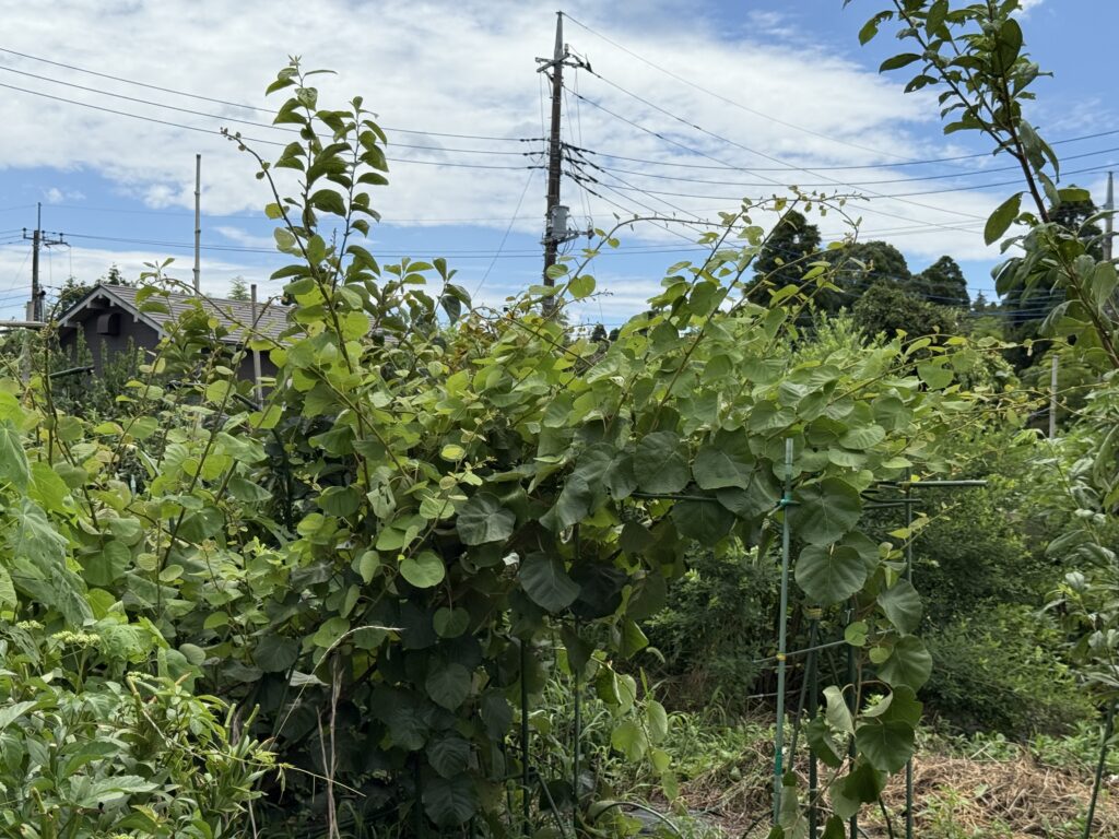 小屋の方の庭にあるキューイ。これは、育ちがいいが、実がなる気配がない。先週の茨城県の農家のキューイは、たくさん実をならせていたんだけれど。